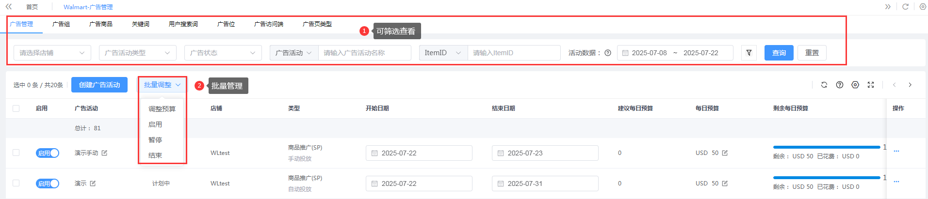 支持批量启用、暂停、结束广告活动,批量调整预算,让您的广告优化更及时,轻松在流量高峰实现高效转化。