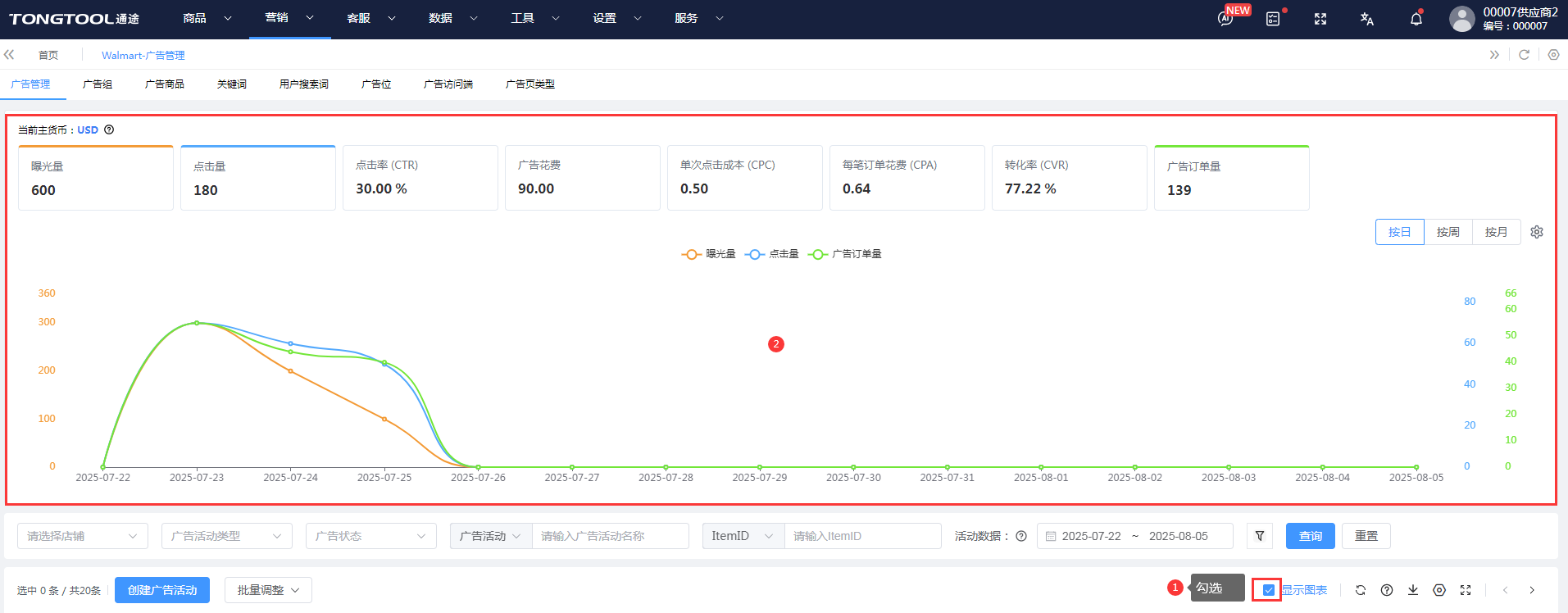 自动生成广告数据报表,从店铺、广告活动、关键词等多维度分析投放效果,帮你快速定位高效广告。